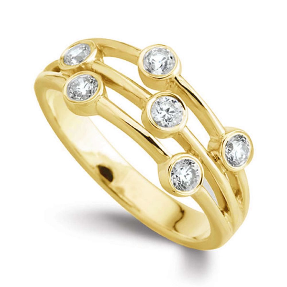 Modern 6 diamond scatter ring, with round brilliant cut diamonds, fully bezel set across a 3 band design.