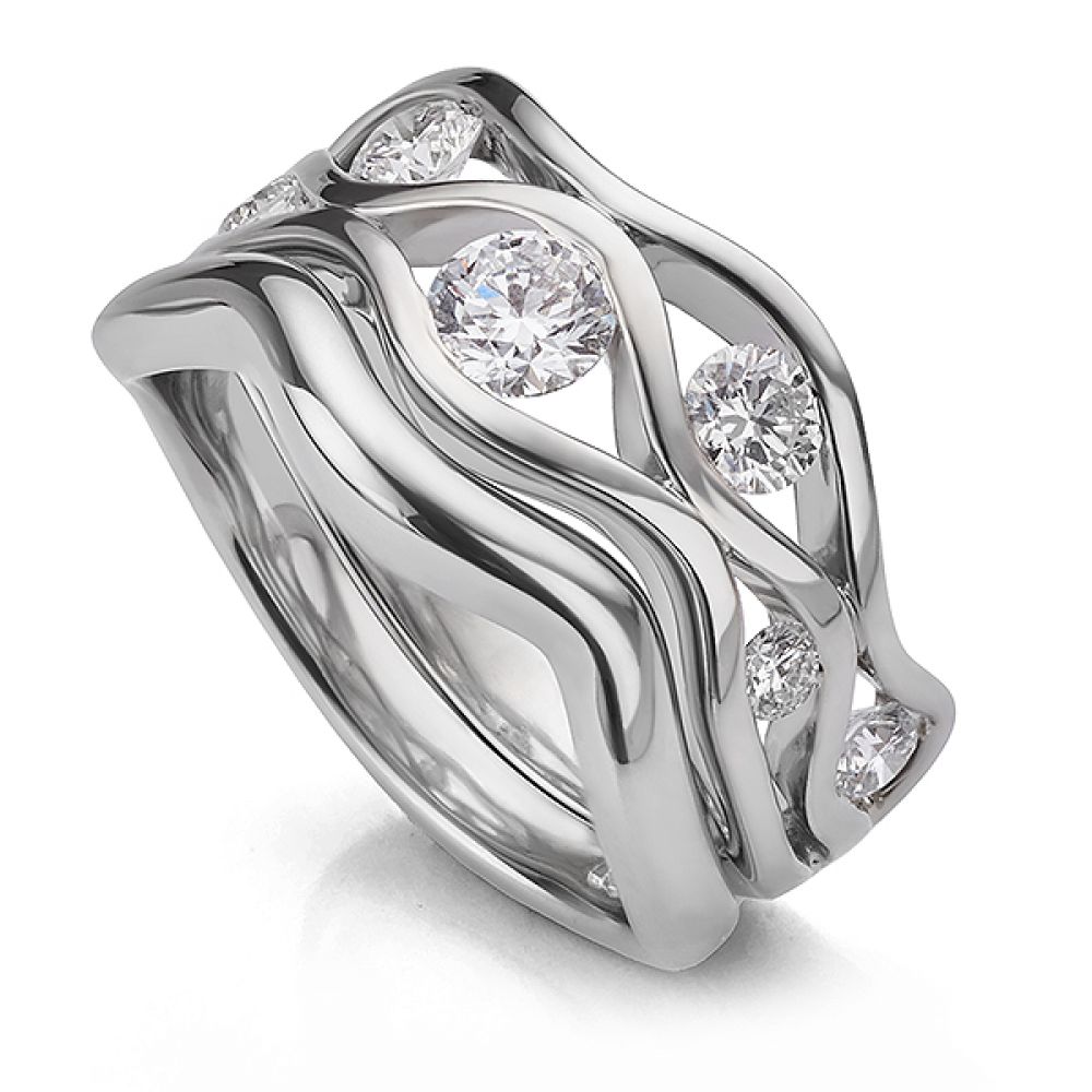 Our bespoke design service provides a valued service to create perfectly fitted bands for unusual and non-traditional engagement rings. Over the years, several clients have chosen designs such as the diamond wave ring, or one of our diamond bubble ring designs. Most of the matching wedding rings we create shape around the outer edge to provide the perfect solution.